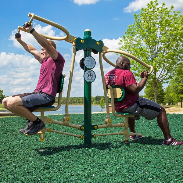 The Vertical Press station delivers targeted upper-body conditioning, replicating a classic pressing movement with the added benefit of outdoor training and resistance customization. With its ergonomic seating and forward-facing handle position, users engage their chest, shoulders, and triceps through a controlled pushing motion.