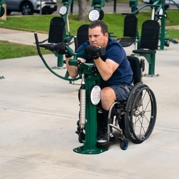 The Accessible Arm Curl delivers a focused upper-body workout that strengthens the biceps and forearms. Featuring 16 levels of adjustable resistance, users can easily customize the intensity to match their fitness level. Designed for inclusivity, this unit allows individuals of all abilities to build arm strength and muscle control in a safe, supportive outdoor environment.
