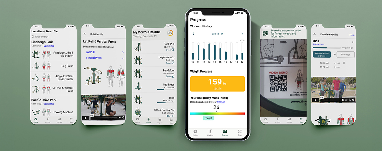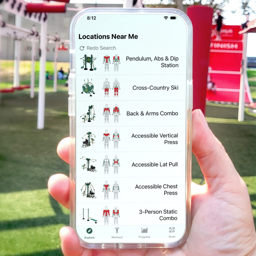 Get The Free Greenfields App Locate outdoor gyms closest to you Learn how to use each piece of equipment Scan to watch demo videos Keep track of each workout See your progress over time